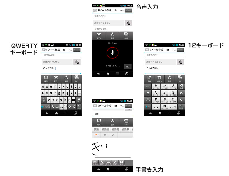 また、入力方式の切り替えにも工夫が凝らされている。たとえば、かな入力は12キーボードで携帯風に入力したいが、英字はQWERTYキーボードのほうが入力しやすいということがある。こんなときでもキーボードのスライドだけで切り替えられるのだ。実はキーボードの切り替えは左隅の「あA1」キーで切り替わるのだが、片手で操作する場合、押しにくいと思ったことはないだろうか。それを解決するのがこの「かんたん入力切り替え」というわけだ。フリックするだけで、文字入力の流れを止めることなく切り替えができるのである。
