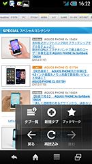ブラウジング中に画面の端を軽くフリックすると、「クイックツールボックス」とよばれるメニューが現れる。これも、ブックマーク、新規タブ、タブ一覧、画面の再読込や戻る、進むといった操作が、片手で簡単にできる機能だ。メニューボタンから機能を呼び出してもいいのだが、どうしても操作が断続的になりがち。「クイックツールボックス」を使えば、フリックした場所にメニューを表示できるので、最短距離で操作できるのである。