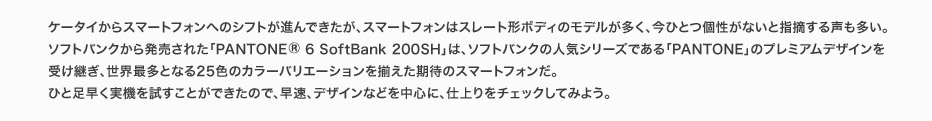スマートフォンはスレート形のボディを採用する限り、どうしても個性が失われる傾向にあり、スリムに仕上げたボディにカバーを装着するなど、やや本末転倒とも言えるパーソナライズが拡がっている感があるが、200SHは世界最多となる25色のカラーバリエーションをラインアップすることで、ユーザーがボディカラーでスマートフォンを楽しめるようにしている。SoftBank Selectionで販売される「ガラシール for PANTONE 6」を組み合わせれば、その楽しさはさらに拡がることになる。そして、こうした外見だけでなく、機能やユーザーインターフェイスなど、内容についてもしっかりと作り込まれているのも見逃せないところだ。見て良し、使って良し、カスタマイズして良しの200SHは、はじめてのユーザーはもちろん、すでにAndroidスマートフォンや他のスマートフォンを使ってきて、買い換えを検討しているユーザーにとってもオススメできる仕上りの一台と言えるだろう。
