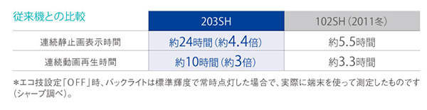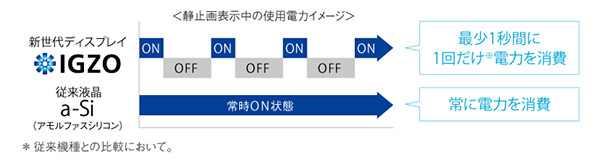 また、一般的に液晶パネルは静止画を表示しているときでも毎秒60回も動作させており、その分、消費電力が増える傾向にある。これに対し、IGZO搭載ディスプレイは毎秒1回の動作で表示を維持できるため、CPUの動作を減らし、結果的に消費電力を抑えることを可能にしている。最近のエコカーでは信号で停止しているときにエンジンのアイドリングを停止させるアイドリングストップが標準的になってきたが、IGZO搭載ディスプレイも同じように、静止画を表示しているときはCPUの動作を抑え、電池の消費を抑え、ロングライフを実現している。たとえば、2011年冬モデルのAQUOS PHONE SoftBank 102SHと比較した場合、連続静止画表示時間は約4.4倍の約24時間になり、連続動画再生時間も約3倍の約10時間を可能にしている。この比較を見るだけでもいかにIGZO搭載ディスプレイの省電力性能が優れているかがよくわかる。