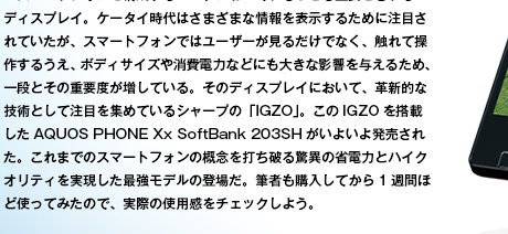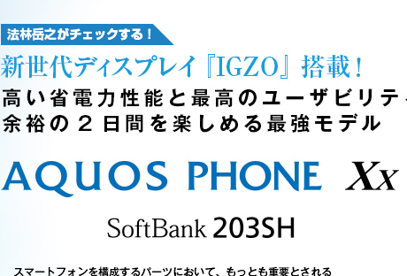 今回、ソフトバンクから発売されたシャープ製スマートフォン「AQUOS PHONE Xx SoftBank 203SH」(以下、203SH)は、スマートフォンを構成するパーツの中でももっとも電力消費への影響が大きいとされる液晶ディスプレイにおいて、革新的な技術である「IGZO」を搭載した液晶ディスプレイを採用することにより、これまでのスマートフォンとは明らかに一線を画した省電力、ハイパフォーマンス、ハイスペックを実現した期待のモデルだ。IGZOについては、すでに本誌をはじめ、一般メディアの記事などでも高い性能が伝えられ、本項の別記事でも詳しく内容について解説しているが、スマートフォンの『電池の持ち』に対する印象を大きく変えてしまうほどのポテンシャルを持つ。「余裕の2日間」というキャッチコピーからもその自信がうかがえるが、そのほかのスペックとも相まって、この春、もっとも期待できるスマートフォンのひとつであることは間違いない。