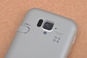 | 背面に装備されているスライド式の緊急ブザー | カメラ機能は、音声でシャッターを切ることや、笑顔で自動撮影などができる |
