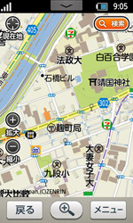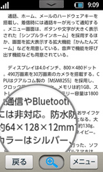 そして、地図やブラウザをはじめ、さまざまなアプリで利用できるのが「かんたんズーム」という機能。[戻る]と[メニュー]の間にある虫眼鏡ボタンを押すと、画面の一部が円状に拡大され、その円を自由にスライドさせることにより、地図やWebページの一部を拡大して表示することができる。ブラウザなどでは拡大した部分のリンクもそのままクリックすることができ、本物の虫眼鏡を当てているような感覚で使え、シニア世代のユーザーならずとも使っていて楽しくなる機能だ。