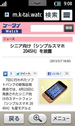 また、スマートフォンで標準的に利用されるアプリとして、ブラウザも使いやすさが考えられたものが搭載されている。スマートフォンのブラウザは限られた表示エリアを最大限に使うため、あまり画面上にアイコンなどが表示されない仕様となっているが、シンプルスマホのブラウザには、[戻る]や[メニュー]などの見やすいボタンをレイアウトし、自分の好みに合わせて、文字サイズも変更できるようにしている。