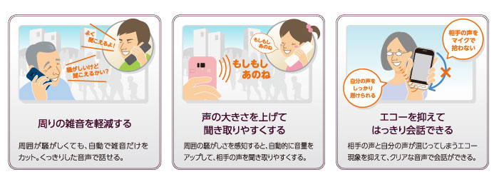 まず、通話については、フィーチャーフォンでもおなじみの「トリプルくっきりトーク」が搭載されている。こちらの周囲の雑音を軽減したり、周囲の騒がしさを検知したときに相手の声の音量を上げて聞きやすくしたり、相手の声と自分の声が混じってしまうエコーを抑え、はっきりと会話できるようにするなどの機能で構成されている。こうした音声サポートの機能はシニア向け特有と捉えられがちだが、実は周囲が騒がしいときの対応などは年齢にかかわらず、誰にでもメリットのある機能だ。