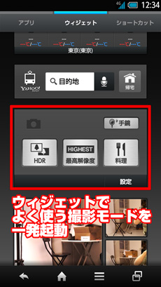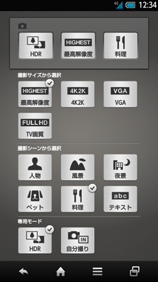 従来モデル同様、よく撮るモードを最大3つまで登録しておき、それぞれの被写体やシチュエーションに合わせた撮影モードでカメラをすぐに起動できる「カメラWidget」、ロック画面から約0.4秒で起動できる「ON速起動」などの便利機能もサポートされている。これらの機能はカメラ起動時にファインダーに表示されるアイコンなどから設定できるが、今回から全体的にユーザーインターフェイスがシンプルになり、非常にわかりやすくなっている。
