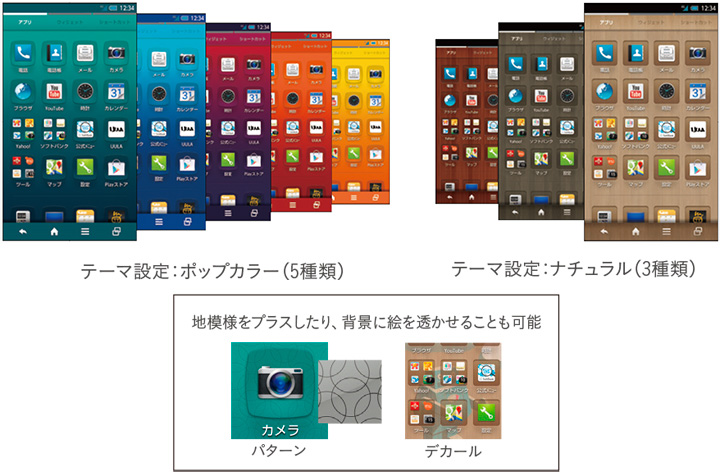 たとえば、Feel UXではアプリ、ウィジェット、ショートカットという3つの縦方向のラインが並んでおり、左右にフリックすることで表示を切り替えることができるが、この切り替え操作にアニメーションと効果音が加わった。Feel UXのテーマも設定できるようになり、5種類のポップカラーと3種類のナチュラルカラーから選んで設定することができる。壁紙もウェルカムシート(ロック画面)と3ラインホーム(ホーム画面)の両方で個別に設定できるようにしている。そして、今回は新たにFeel UXをもう一段、やさしく使ってもらうために、アプリケーションシートのみで構成するシンプルモードも用意されている。