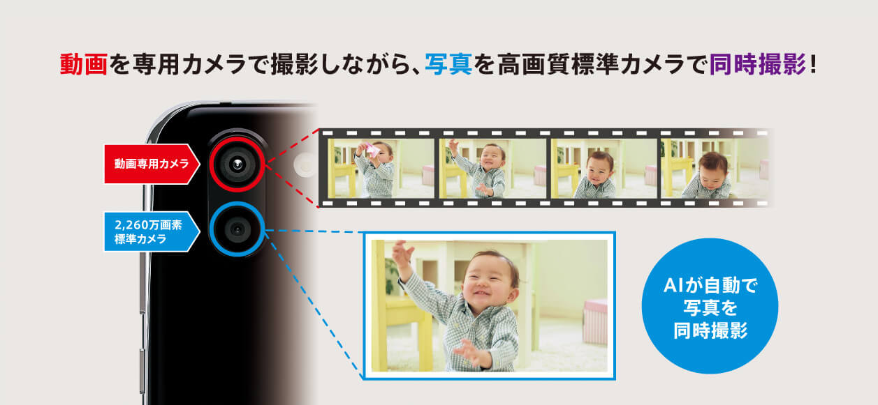動画専用カメラと高画質標準カメラによるツインカメラを搭載