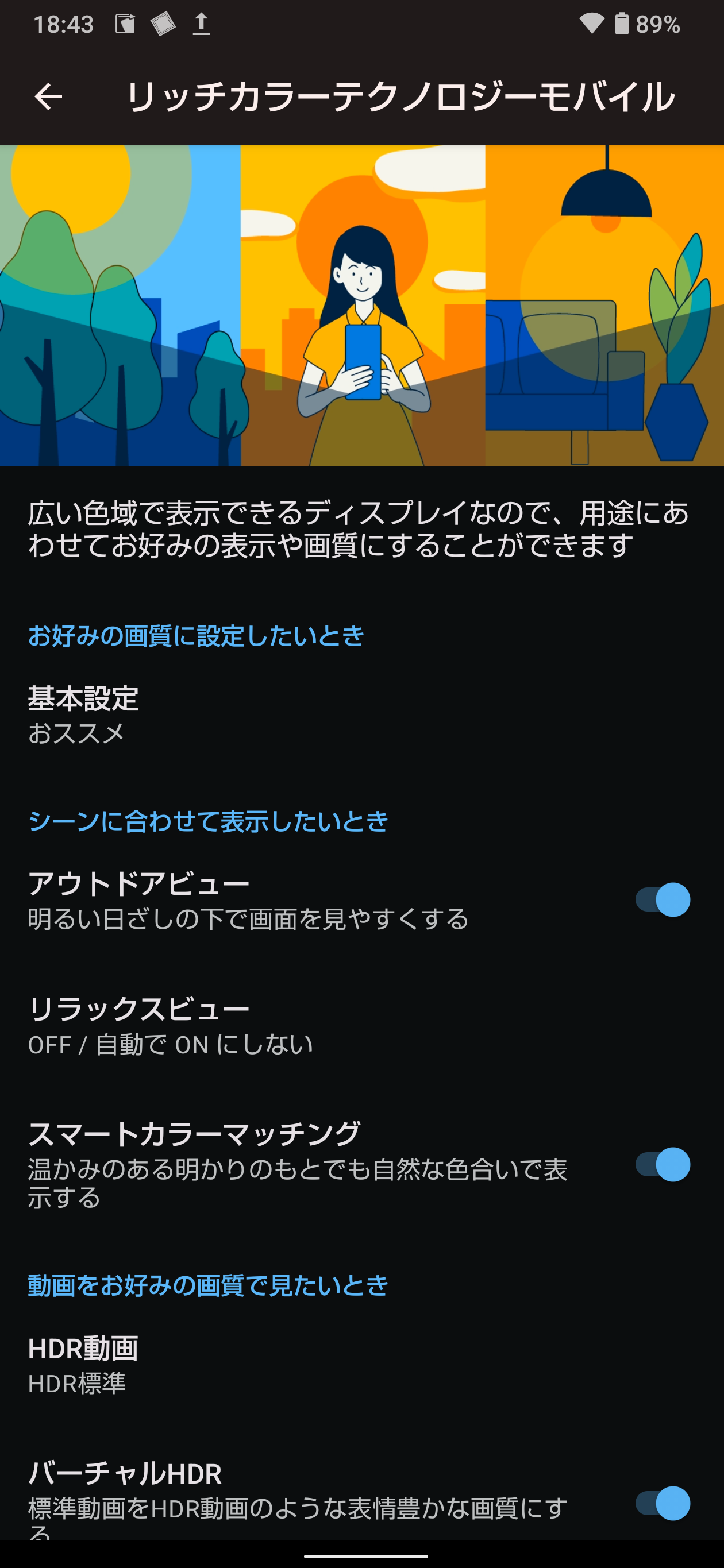 こうした優れたディスプレイ性能を実現しながら、アイドリングストップなどの独自技術を活かすことにより、優れた省電力性能も両立させている。周辺環境に合わせて、画質を最適化する「スマートカラーマッチング」、太陽光の下でも見やすい「アウトドアビュー」なども搭載されており、いつでもどこでも常に最高レベルの画質で、さまざまなコンテンツを楽しむことができる。