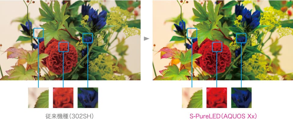 ディスプレイは前述の通り、一般的なスマートフォンとしては最大クラスとなる約5.7インチのフルHD対応「S-CG Silicon液晶」を採用する。ディスプレイが大型化すると、バックライトの光量や色味などに変化が出てしまうケースもあるが、液晶テレビ「AQUOS」をはじめ、液晶パネルメーカーとしてのシャープのこだわりが活かされ、新開発のバックライトとカラーフィルタを組み合わせた「S-Pure LED」(エスピュアレッド)が搭載される。従来機種に比べ、光の三原色すべての色の再現性を向上させ、全体的に非常に色鮮やかな映像を楽しむことができる。国内外の市場ではディスプレイにこだわりのあるメーカーを中心に、色の再現性を追求するモデルが出始めており、AQUOSスマートフォンもその競争軸に挑もうという構えだ。