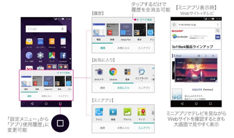 たとえば、履歴キーを押したときに表示される「クイックランチャー」は、起動したアプリの履歴を表示して、切り替えられるだけでなく、お気に入りのアプリを登録しておいたり、ウィンドウ表示が可能なミニアプリを起動することもできる。大画面を活かし、Webページを閲覧しながら、ミニアプリでテレビをウィンドウ表示するといった使い方も可能だ。ちなみに、設定メニューから操作すれば、履歴キーで表示するメニューをAndroid標準のアプリ使用履歴に切り替えることも可能だ。