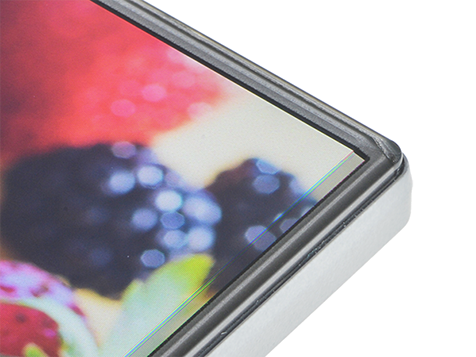 画面のフレームを極限までなくし、さらにディスプレイ端を斜めにカッティングすることにより生まれるレンズ効果により、驚異的な狭額縁感を実現。