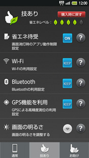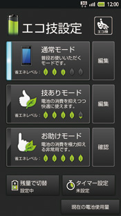 実際の利用スタイルとしては、エコ技を活かした省電力で使いたいときは、普段から技ありモードに設定しておき、それでも電池残量が厳しくなったときはお助けモードに切り替えて乗り切るといった使い方をする。もし、標準設定で使いたいときは通常モードに戻すこともできるが、技ありモードをベースに、各項目を少しずつカスタマイズすることも可能だ。また、時間帯別にそれぞれのモードを切り替えることもできるため、利用頻度の多い昼間は技ありモード、自宅などに帰ることが多い夜間は通常モードといった設定もできる。実際に、数日間、試用した範囲でもステータスバーの電池残量アイコンが急激に減るようなことはなく、ユーザーの利用頻度や利用スタイルにもよるが、エコ技の効果は十分にあり、ビギナーにも扱いやすい機能になっていると言えそうだ。