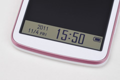IS13SHのディスプレイが特徴的なのは、IS03でも好評を得た常時表示が可能なメモリ液晶を組み合わせたコンビネーション液晶となっている点だ。多くのスマートフォンでは画面がオフになるスリープモードの状態で、電源ボタンを押し、画面に触れて、ロックを解除するといった操作が必要になるが、IS13SHはメインディスプレイの下の部分が56×304ドット表示が可能なメモリ液晶となっており、メインディスプレイが消えているときでも日時やマナーモードの設定、電池残量、不在着信や新着メールの件数などを表示できるようになっている。つまり、ケータイのサブディスプレイの感覚で、さまざまな情報を表示できるわけだ。しかもIS03に比べ、表示できる情報の種類は格段に増え、デザイン時計やLISMO Playerの情報、メール着信時の発信者名なども表示でき、表示も白背景と黒背景を切り替えられるようにしている。