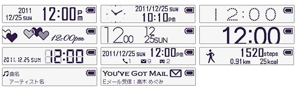 時計の表示は7種類のグラフィックパターンから選べる。そのほかにも、不在着信や新着メールの通知、歩数計やLISMO Playerの情報表示、メール受信時のアニメーション表示ができる
