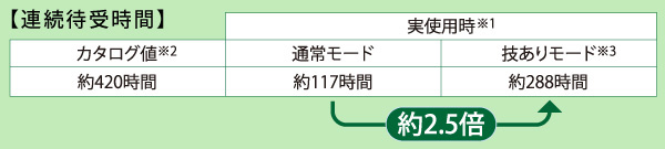 ※2 お買い上げ時の設定、待受(画面OFF)時で、電波を正常に受信できる静止状態での平均的な利用時間。