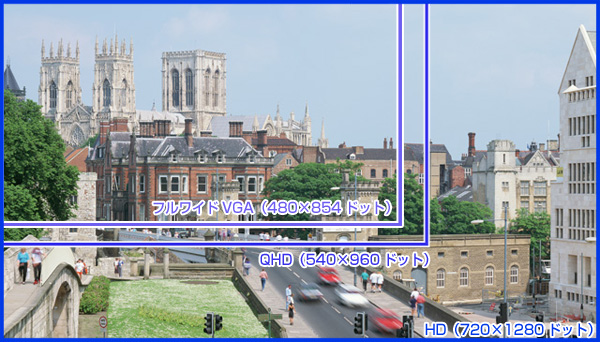 SH-01Dが採用する720×1280ドット表示のHD液晶は、フルワイドVGA液晶に対して約2.2倍、QHD液晶に対して約1.8倍もの高密度な表示が可能