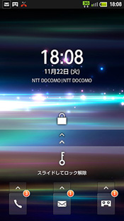 ステータスバーにはメールや着信があったときにアイコンが表示されるが、ホーム画面がロックされているときは、ロックを解除した上で、ステータスバーを表示するといった操作が必要になる。しかし、SH-01Dではロック画面に新着通知が件数と共に表示され、そこから直接、各機能の画面を表示することが可能だ。