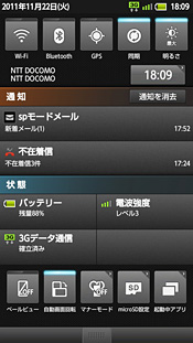 また、従来モデルから継承されてきた使いやすさもSH-01Dの魅力のひとつだ。たとえば、ステータスパネルは単純に端末のステータスを表示するだけでなく、Wi-FiやBluetooth、GPSなどの機能を切り替えられるうえ、ベールビュー、自動画面回転、マナーモード、microSD設定、起動中アプリなどもすぐに設定できる。ホーム画面から[アプリケーション一覧]-[設定]の順に辿らなくてもいいわけだ。ちなみに、起動中アプリの画面はホームキーの長押しでも表示でき、起動中の全アプリを一括で終了させることもできる。