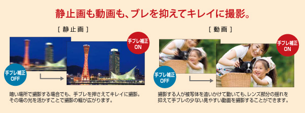 現在、ケータイやスマートフォンに搭載されているものをはじめ、一部のデジタルカメラにも搭載されている手ブレ補正機能は、ISO感度を上げながら、同時に複数枚の画像を撮影し、それを合成することで、ぶれていない写真を生成する方法を採っている。つまり、ソフトウェア的に画像処理をすることで、電子的に手ブレを抑えているわけだ。この方法はケータイやスマートフォンで実現できるが、手ブレ防止の効果が十分に得られないこともあるうえ、切り出しや合成などの作業をするため、どうしても画質が劣化してしまう傾向がある。