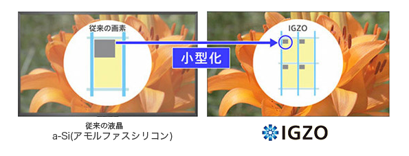 IGZOについては、これまでも何度もくり返し説明してきているが、世界ではじめてシャープが量産化に成功した酸化化合物で、「インジウム(In)」「ガリウム(Ga)」「亜鉛(Zn)」「酸素(O)」によって構成され、これを液晶パネルのTFT(薄膜トランジスタ)に使うことで、高精細かつ低消費電力を実現することができる。一般的に、TFT液晶パネルは素子が格子状に仕切られ、それぞれの枠にはひとつずつ薄膜トランジスタが付けられており、ここに電気を通し、枠内の液晶を変化させ、バックライトの光を通したり、遮ったりすることで、文字やグラフィックを表示させている。ところが、この薄膜トランジスタは液晶パネルのそれぞれの素子の枠内に付けられているため、自らもバックライトの光を遮ってしまっている。