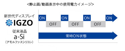 また、IGZO液晶ディスプレイの省電力性能で、もうひとつの大きなアドバンテージが「液晶アイドリングストップ」だ。一般的にアモルファスシリコンによる液晶パネルは、毎秒60回もCPUによる書き換え動作が発生するのに対し、IGZO液晶ディスプレイは最小で毎秒1回、動画も従来の半分(30fps時)の書き換えで済むため、電池の消費を抑えることができる。クルマのアイドリングストップと同じように、待機時や停止時のロスを大幅に減らすことができるわけだ。