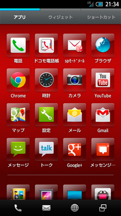 使いやすさの面については、シャープが今年夏から搭載しているホームアプリ「Feel UX」の「3ラインホーム」が継承されており、スマートフォンがまったくはじめてのユーザーでもすぐになじむことができる。Feel UXについて、少しおさらいをしておくと、一般的なAndroidスマートフォンは起動するとホーム画面が表示され、アプリケーションボタンをタップすると、インストールされたアプリケーション一覧が表示される。これに対し、Feel UXは起動すると、いきなりアプリ一覧画面が表示され、上段のタブをタップすることで、アプリケーションシート、ウィジェットシート、ショートカットシートの3つのシートを切り替えながら使うことができる。それぞれのシートは縦方向にスクロールする仕様だが、ピンチ操作をすることで、アイコンの間にセパレータを追加したり、削除したりすることができる。今回のSH-02Eに搭載されているFeel UXは、夏モデルのものよりも進化しており、それぞれのシートのタブの部分をロングタッチすることで、位置を並べ替えることができる。また、それぞれのシートの最下段を表示しているとき、さらに下方向にスクロールさせようとすると、そこが終端であることがわかるように、アプリのアイコンがアニメーションするなど、細かい部分でもユーザーが気づくように作り込まれている。ちなみに、すでにAndroidスマートフォンの標準ユーザインターフェイスに慣れているユーザーは、NTTドコモが提供する「docomo Palette UI」に切り替えて利用するか、今後、メーカーサイトで公開される「SHホーム」を利用することもできる。