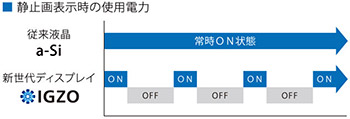 この低消費電力化については、もうひとつIGZOならではのアドバンテージがある。一般的なアモルファスシリコンの液晶は、まったく動きがない静止画を表示しているときでもその画面表示を維持するため、CPUと液晶パネルは1秒間に60回も動作している。これに対し、IGZOは1秒間に1回動作するだけで、表示を維持することができるため、それ以外の時間はCPUの動作を休止することができる。ちょうどクルマのアイドリングストップと比較するとわかりやすいが、従来のアモルファスシリコンによる液晶パネルは信号で停まっているときも常にエンジンが動いたままのアイドリング状態であるのに対し、IGZOは信号で停まったときはアイドリングを止め、消費電力をグッと抑えることができる。シャープがテストしたところによれば、2011年冬に発売されたAQUOS PHONE SH-01Dと比較したところ、連続静止画の表示時間は約4.8倍の約24時間、連続動画の再生時間も約2.8倍の約11時間を実現しているという。