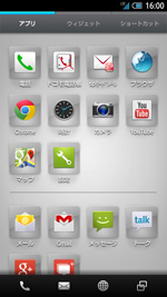 3ラインホームは画面上段の「アプリ」「ウィジェット」「ショートカット」と書かれたタブで表示を切り替えることができ、それぞれのシートは縦方向にスクロールさせることができる。アプリケーションシートはその名の通り、SH-04Eにインストールされているアプリが登録されており、アプリのアイコンをドラッグして、重ね合わせることでフォルダにまとめたり、使わないアプリを非表示に切り替えることもできる。