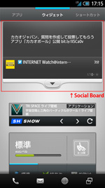 ウィジェットシートはAndroidプラットフォームの特徴のひとつであるウィジェットを貼り付けておくためのスペースだが、SH-04Eでは新たにFacebookやTwitter、mixiなどの更新情報をチェックできる「Social Board」が追加された。それぞれのSNSに対応したアプリを起動しなくてもすぐに興味のある投稿を確認できるのは、スマートフォンに慣れたユーザーにとっても有用だ。