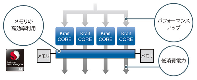 クアッドコアCPU「Snapdragon S4 Pro」を搭載。アプリに応じて動作するコアをコントロールすることで、ハイパフォーマンスと低消費電力をバランスさせている |
