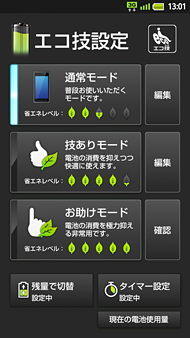大画面ディスプレイにハイパフォーマンスのCPUとなると、ユーザーとしてはバッテリーの消費が気になるところだが、シャープでは昨年末に登場したモデルから独自の「エコ技」という機能を搭載することにより、高品質な表示とロングライフの両立を実現している。エコ技はディスプレイの省電力化を可能にするバックライト制御をはじめ、複数のアプリを起動したときのムダな電力消費を自動的に抑制することにより、全体的なバッテリー消費を抑える機能だ。エコ技には「通常モード」「エコ技モード」「お助けモード」の3つの動作モードが用意されており、自分の好みに合わせて、3つのモードをワンタッチで切り替えることができる。たとえば、電池残量が50%を切ったら、自動的にエコ技モードの切り替えたり、自分のライフスタイルに合わせ、各機能の動作を切り替えることで、全体的な電力消費を抑えるといった設定もできる。ちなみに、SH-06Dは緊急地震速報にも対応しているが、緊急地震速報を受信すると、長時間、充電ができなくなることを考慮し、エコ技の「お助けモード」に切り替えるかどうかを確認するメッセージが表示されるなど、他の機能との連動も実現されている。