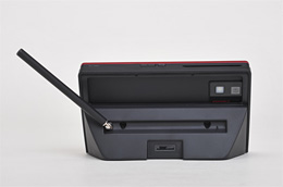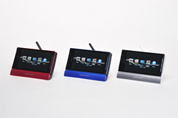 | 本体カラーに合わせた卓上ホルダが付属する | 本体をセットすると、NOTTVやYouTube、ワンセグなどの起動アイコンが並ぶチャージングメニューが表示される | 卓上ホルダには、NOTTVの受信感度を向上させるアンテナが搭載されている |