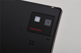 背面に備えられたオートフォーカス対応カメラは、800万画素CMOSイメージセンサーを採用し、静止画はもちろん、高画質の1280×720ドットのハイビジョン動画も撮影することができる。撮影した静止画や動画はすぐに保存され、すぐにブログやソーシャルサービスへ投稿することができる。静止画については、iモード携帯電話をはじめ、フィーチャーフォンに送るときやブログに投稿するとき、最大サイズで送信すると、ファイルサイズが大きすぎ、受信できなかったり、うまくブログに投稿できないといったことがあるが、SH-06Dは他のSHシリーズのスマートフォン同様、最大サイズで撮影した写真をリサイズできる編集機能が搭載されているため、常に適切なサイズの写真を送信したり、投稿することができる。