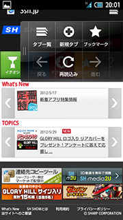 ブラウザを利用しているときの「クイックツールボックス」も便利な機能だ。ブラウザでは画面の解像度を活かすため、Webページの読み込みが完了すると、アドレスバーなどの表示が隠れるが、SH-07Dでは画面端からフリックすると、よく使うメニューが表示され、複数のWebページを表示しているときのタブの切り替えや追加、ブックマークの表示、Webページの再読込などの操作が片手で簡単にできる。