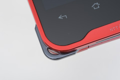 また、ボディ全体のデザインもこれまでのスマートフォンと違ったセンスのいい個性が感じられる仕上りとなっている。ボディ周囲にメタリックフレームを採用し、本体の左下角に備えられたストラップホールがボディデザインのアクセントとなっている。メタリックフレームは背面と同じボディカラーに仕上げられ、引き締まったBLACK、さわやかなLIME、アクティブなREDというそれぞれのボディカラーを際立たせている。本体前面のほとんどをディスプレイが占めるスマートフォンでは、どうしてもボディカラーの印象が薄くなる傾向にあるが、SH-07Dは前面や側面から見たときもハッキリとボディカラーがわかるデザインとなっており、手に持ったとき、デスクに置いたときなどの存在感は、他のスマートフォンとひと味違う印象だ。また、コーナーストラップホールはデザイン上のアクセントになっているが、ネックストラップを付けて、首から提げて持ち歩くのもいいし、コンパクトなボディを演出するカッコいいストラップを付けるのも楽しいだろう。最近、一部の機種ではストラップホールが備えられていないが、実用面だけでなく、自分なりの個性を主張するという意味から考えても必要なものであり、SH-07Dはそれをうまくデザインに組み込んでいる。
