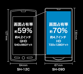 そこで、シャープでは「Edge to Edge設計」を採用することにより、液晶パネルの左右のフレームをギリギリまでスリム化し、幅約67mmというサイズに4.7インチの大画面ディスプレイを収めている。ボディ前面に占めるディスプレイの面積は、昨年夏に発売されたAQUOS PHONE SH-12C(約4.2インチ)が約59%だったのに対し、SH-09Dは約70%になり、スマートフォンを持つと言うより、液晶パネルを持つような感覚になってしまうほど、画面の大きさや広さを実感できるデザインにまとめられている。