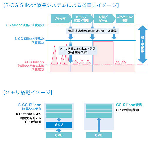 液晶パネルそのものの透過率を向上させ、従来の4.5インチのCG Silicon液晶と比べ、2倍の明るさを実現し、バックライト電流を抑えている。もう少しわかりやすく説明すれば、液晶パネルそのものが従来よりも光を透過しやすいため、バックライトを従来モデルほど、明るくしなくても済み、結果的に省電力化が可能になるというわけだ。これに加え、S-CG Silicon液晶にメモリを内蔵することでも省エネを可能にしている。これまでのCG Silicon液晶ではディスプレイがONの状態で、何かを表示しているときは、常に本体のCPUが稼働していたが、S-CG Silicon液晶ではメールや写真などを静止表示しているとき、CPUからの画像伝送を停止し、メモリに蓄えられた情報を表示するため、CPUの消費電力を抑えることが可能になる。特に、スマートフォンなどのモバイル端末の場合、テレビなどのように、常に動きのある映像を表示しているわけではなく、メールやWebページを閲覧したり、写真を表示したりするときなどは、一時的にディスプレイの表示が静止状態になる。ユーザー側から見れば、非常に短い時間でしかないが、システムから見れば、こうした細かい省電力の積み重ねが連続稼働時間の向上につながるわけだ。