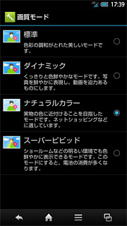 SH-09Dに搭載されたS-CG Silicon液晶は、省電力以外の面でも優れている。シャープの液晶テレビ「AQUOS」で培われた技術を応用した高画質エンジンは、最新の「SVエンジン3」が搭載されているが、画質モードとして、色空間の国際標準規格「sRGB」に合わせてチューニングしたナチュラルカラーモードを搭載している。一般的に、ディスプレイはそれぞれの特性の違いにより、少しずつ色彩に差があるが、パソコンでは国際標準規格「sRGB」を採用することにより、違うディスプレイでも基本的には同じカラーを再現できるようにしている。スマートフォンで閲覧するパソコン向けやスマートフォン向けのWebページの多くは、当然のことながら、制作にはパソコンが使われ、基本的にはパソコンで利用される色空間、つまり、sRGB対応環境での再生を想定している。そこで、SH-09DもディスプレイにsRGB対応のカラーモードを搭載することにより、オンラインショッピングなどで商品の写真を見ても制作者側が意図したものに近い色合いで再現されるようになる。