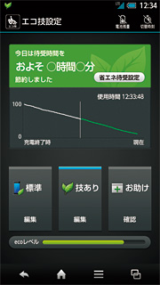 これだけハードウェアが充実していると、バッテリー消費が気になるところだが、シャープでは昨年末のモデルに引き続き、独自の「エコ技」機能を搭載している。「標準」「技あり」「お助け」の3つのモードが用意されており、ユーザーの利用状態や電池残量に合わせ、モードを手動、もしくは自動で切り替えながら利用することができる。このエコ技は元々、液晶ディスプレイのバックライトやアプリの動作などをコントロールすることで、電力消費を抑えてきたが、今回はバックグラウンドで動作する回数が多いアプリを表示し、ユーザーにエコ技の設定をおすすめする機能が追加されるなど、一段と使いやすく、省電力しやすくなっている。今回はまだ試用期間が短いうえ、人によって、利用環境が異なるため、あまり確定的なことは言えないが、それでも他機種や従来モデルよりも電池残量が長くなっており、ケータイから移行するユーザーにとっても安心して選べる機種に仕上がっている印象だ。