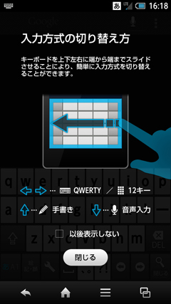 こうしたシャープならではの独自の工夫として、非常に便利なのが文字入力に新たに採用された「文辞技」だ。スマートフォンで文字入力をするには、一般的に画面に表示されたテンキーやQWERTYキーのソフトウェアキーボードを使うが、ある程度、使い慣れてくると、日本語はテンキーでフリック入力、アルファベットはQWERTYキーといった具合いに、頻繁にソフトウェアキーボードを切り替えるようになる。そこで、SH-10Dではソフトウェアキーボードを上下左右に端から端までドラッグすることで、このソフトウェアキーボードや入力方式を簡単に切り替えられるようにしている。左右のドラッグではテンキーとQWERTYキー、上方向は手書き入力、下方向は音声入力に切り替えられる。手書き入力については、「会ぎ」のように漢字とかなが混じった状態で入力しても「会議」と認識される。また、新規メールを作成するとき、通常は変換候補などが表示されない状態でスタートするが、文辞技では「いきなり予測変換」により、メールでよく使う言葉がすぐに変換候補として表示される。