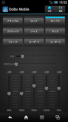 独自の音楽プレイヤー「Music'n Player」では、「Dolby Moline v3」に対応しており、さまざまなプリセットが用意されている