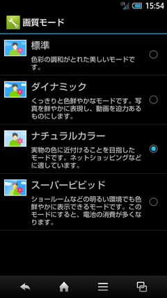 ディスプレイ関連で、もうひとつ特筆すべきは、同社の液晶テレビ「AQUOS」で培われたノウハウを活かした画質調整技術として、最新の「SVエンジン3」が搭載されたことだろう。スマートフォンは従来のケータイに比べ、ディスプレイサイズが大きいため、今まで以上にインターネット上のオンラインショッピングなどを利用するケースが多いが、スマートフォンで表示したときと実際の商品で、色の印象が異なるといったことが起きる。これは機種ごとにディスプレイの色彩の調整が少しずつ異なるためだが、SVエンジン3では色空間の国際標準規格である「sRGB基準」に合わせてチューニングをした「ナチュラルカラーモード」を搭載することで、ディスプレイごとの色彩の違いを解消し、実物の色に近づけた表示を可能にしている。ちなみに、sRGB規格はパソコンで標準的に使われており、多くのスマートフォン向けサイトもパソコンで製作されているため、スマートフォンのディスプレイ側をsRGBに調整すれば、制作者が意図した色彩で商品が表示されるという考えだ。