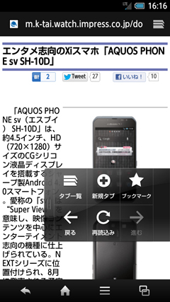 同じく、ユーザーインターフェイスに関わるところでは、ブラウザを便利に使うための「クイックツールボックス」もおすすめだ。Webページを閲覧中の「戻る」「再読込」「ブックマーク」といった機能をすばやく呼び出せるようにしたもので、画面の端からスライドさせると表示される。左右のどちらの端からでも表示できるので、右手で持つ人も左手で持つ人も簡単に使うことができる。