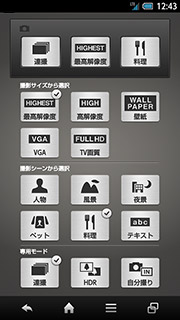 ディスプレイとも関わりの多いカメラについては、本体背面に裏面照射型CMOSセンサーによる1312万画素カメラを搭載する。スマートフォンの場合、ボディサイズが大きく、折りたたみなどのケータイとは手に持ったときの感覚が違うため、撮影時に手ぶれを起こしてしまうことがあるが、SHL21では、新たにレンズの駆動による光学手ぶれ補正を搭載し、手ぶれが起きやすい暗いところでの撮影やズームアップしたときの撮影でも、クリアに静止画や動画を撮影できるようにしている。ちなみに、ズームや明るさの調整もタッチパネルでの操作が可能だ。また、撮りたいときにすぐ撮影できるように、Feel UXのウェルカムシートから約0.4秒でカメラを起動できる「ON速起動」 に対応する。カメラの使い勝手の面で、なかなか実用的なのが「カメラウィジェット」だ。SHL21にはシーン別撮影をはじめ、多彩な機能が搭載されているが、これらの内、3つをカメラウィジェットに登録でき、ウィジェットシートから直接、起動できるようにしている。