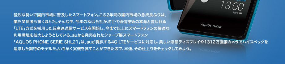 auから発売されたシャープ製スマートフォン「AQUOS PHONE SERIE SHL21」は、まさにそんなユーザーのニーズにしっかりと応えてくれる期待のモデルだ。モバイルデータ通信は、auが本格的にサービスを展開する4G LTEサービスに対応し、4.7インチのS-CGSilicon液晶ディスプレイ、CPUに米クアルコム製の1.5GHzデュアルコアプロセッサ「SnapDragon S4 MSM8960」、裏面照射型CMOSセンサーによる1312万画素カメラ、2040mAhの大容量バッテリーという最高峰レベルのハイスペックを実現しながら、ワンセグ、おサイフケータイ、赤外線通信、防水・防じんという日本仕様もしっかり対応し、なおかつシャープならではの使いやすさにもこだわったスマートフォンに仕上げられている。かつてのIS03が国内のスマートフォン市場を本格的に拡大するきっかけになったように、このSHL21もスマートフォンを今まで以上に快適に活用する新しい時代へ向けたモデルとして、開発されているわけだ。