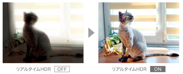 画面全体が明るく撮れるHDR撮影。さらに、リアルタイムHDR搭載で、HDR撮影の「合成ミス」が軽減される