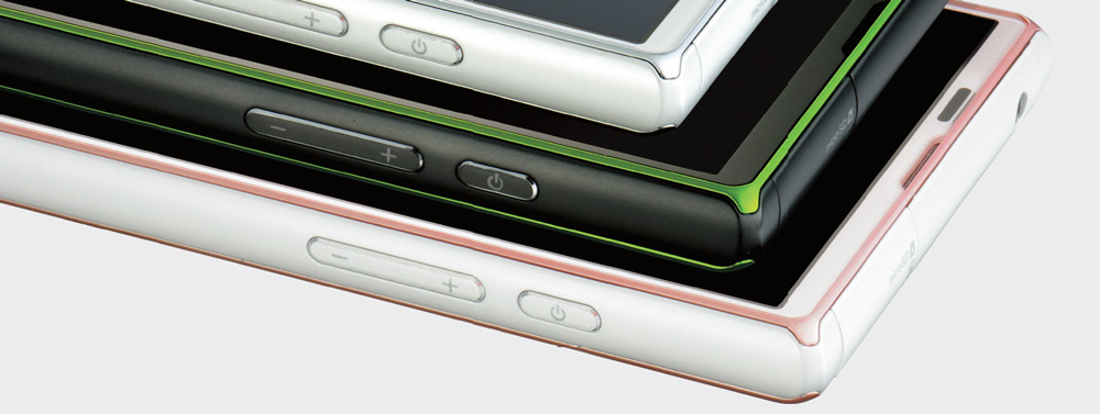 今回のSHV32もEDGESTデザインを継承しているが、側面や周囲のフレームに新しい個性を取り込んでいる。カラーバリエーションはホワイト、グリーン、ピンクの3つがラインアップされており、ホワイトとピンクは前面パネルにもカラーリングが施され、各色ともフレーム部分にラインを入れている。これにより、本体前面から見たときの印象が各色とも異なり、他機種とも違ったアクセントのある個性を演出する。