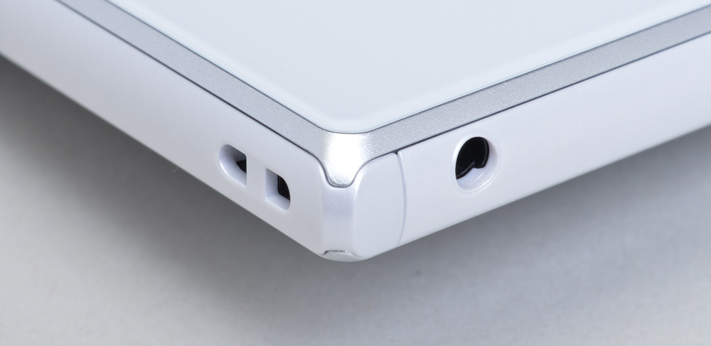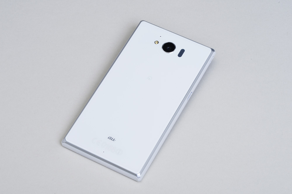 側面部分もわずかにラウンドさせた形状を採用し、右側面に備えられた電源キーや音量キーは突起を少なくしながら、メタリックな輝きを活かした仕上げとなっている。ただの平べったい板ではなく、上質なデザインと手当たりが良く、持ちやすい形状にまとめられている。ちなみに、左側面にはキャップレス防水のmicroUSB外部接続端子、その少し上側にはストラップホール、上部には3.5φのステレオイヤホン端子、microSDメモリーカード/au ICカードスロットが備えられている。
