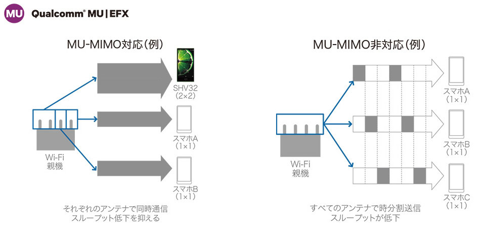 通信関連では無線LANがIEEE802.11a/b/g/n/acに準拠するが、Qualcommが開発した「MU-MIMO(MultiUser-Multi Input Multi Output)」に対応するため、MU-MIMO対応の無線LANアクセスポイントの設置された環境では、複数の端末が接続してもSHV32のスループット低下を抑えることができる。